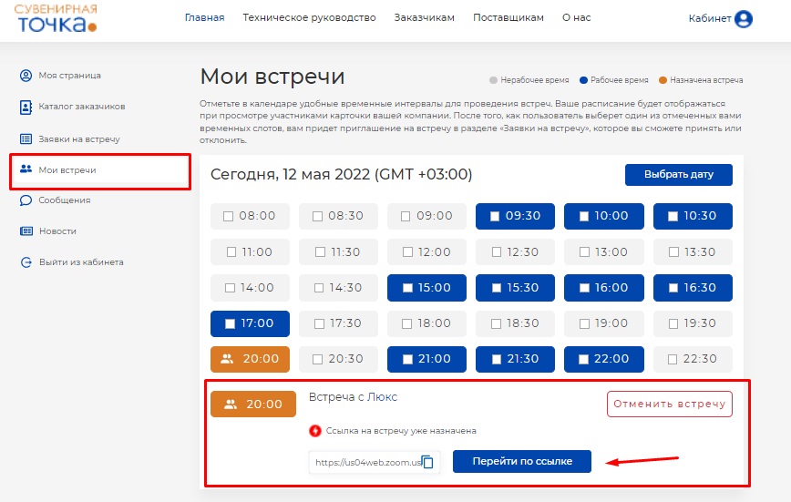 Назначенная вами встреча будет отражена в разделе "Заявки на встречу". Если она будет подтверждена компанией, то станет видна в разделе "Мои встречи".