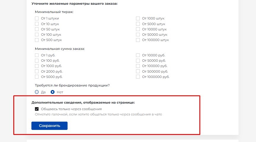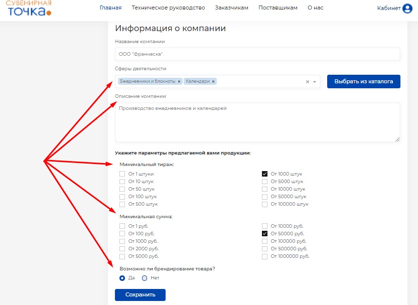 Особенно важно заполнить поля "Сферы деятельности", "Минимальный тираж", "Минимальная сумма заказа", "Брендирование".