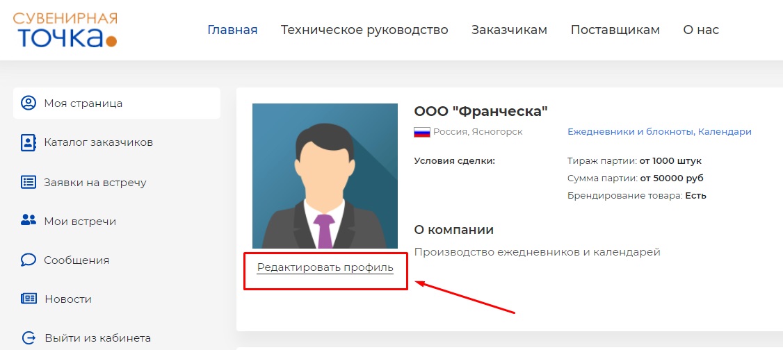 В личном кабинете обязательно заполните всю необходимую информацию. Для этого нажмите на кнопку "Редактировать профиль".