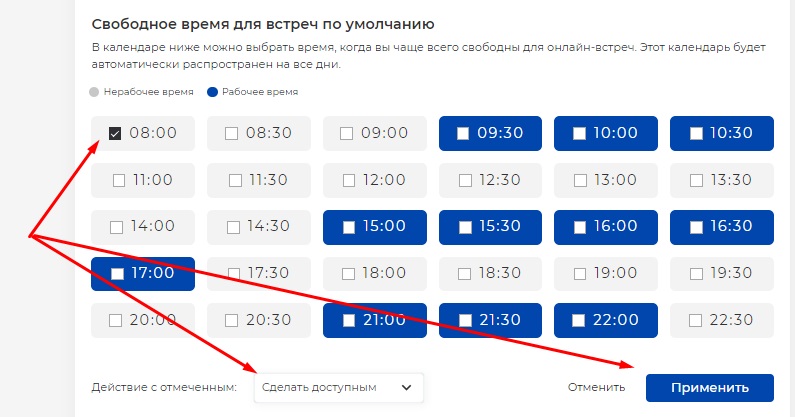 Внизу страницы в разделе "Свободное время для встреч по умолчанию" необходимо обязательно выставить свободные временные интервалы (то время, в которое вы будете доступны для встреч). Для этого проставьте галочки в нужные ячейки и нажмите кнопки "Сделать доступным" и "Применить". Если слоты не проставлены, вы не сможете назначать встречи и принимать приглашения.