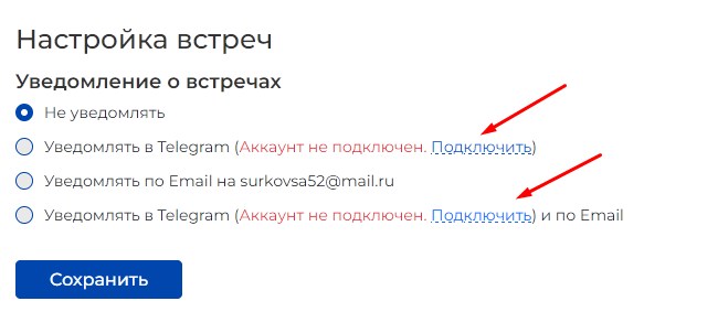 Если вы хотите получать уведомления о встречах и входящих сообщениях на электронную почту или WhatsApp, поставьте галочку в соответствующем окошке "Настройка встреч / "Уведомление о встречах". Существуют следующие виды возможных уведомлений: о том, что вам назначена встреча / о том, что ваша заявка на встречу принята или отклонена / о том, что встреча отменена или перенесена / о том, что ссылка на встречу появилась в ЛК / о том, что встреча состоится через час / о том, что вам пришло сообщение в чат (раздел "Сообщения").