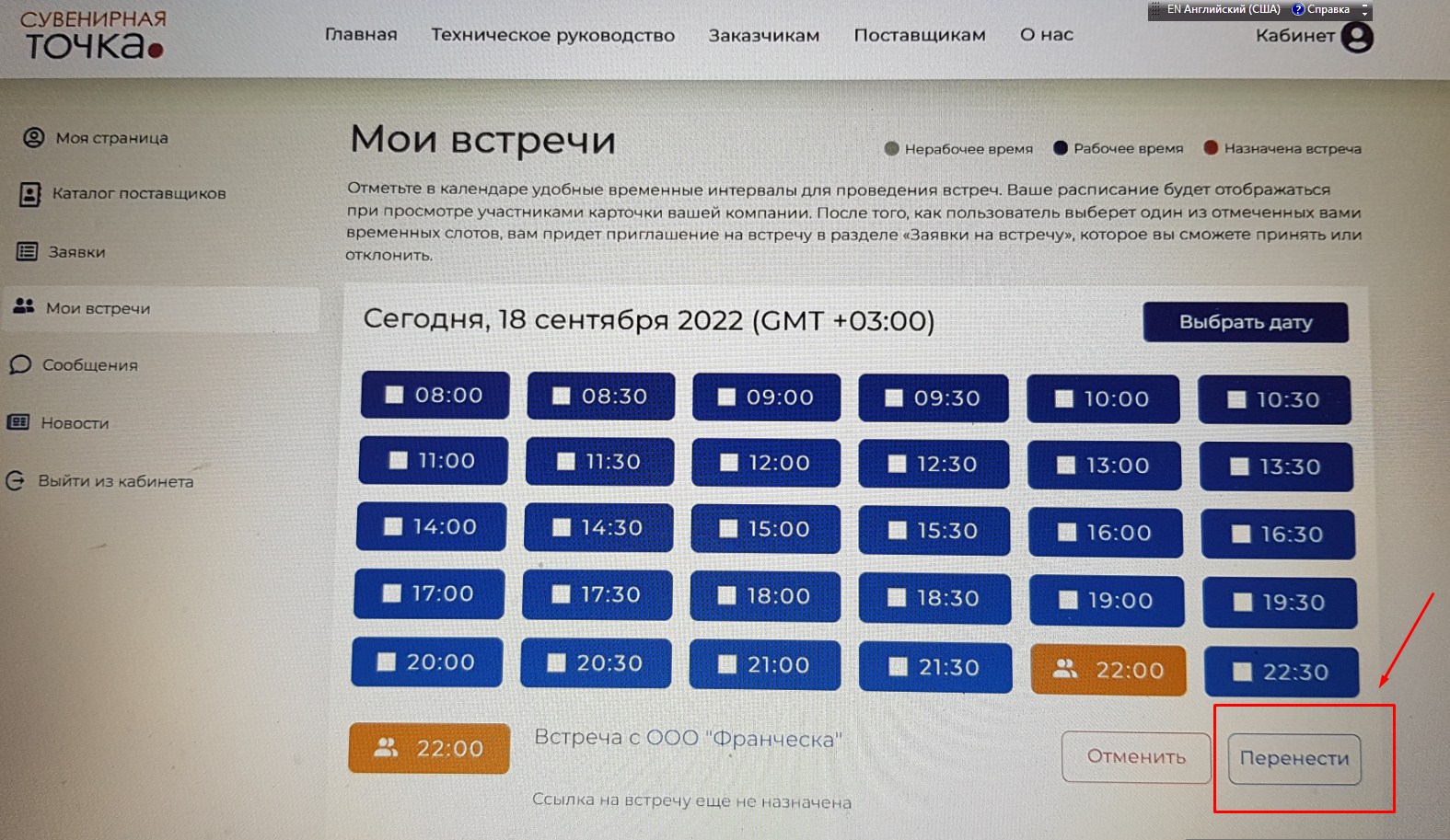 Выбрав интересующую компанию в каталоге, кликнув на ее название, вы переходите на карточку компании, где вы можете назначить встречу в свободные временные интервалы, выделенные синим цветом. Одна встреча длится не более 30 минут. При желании вы можете выбрать два временных слота подряд.